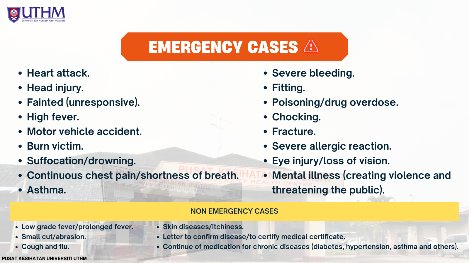 Pada waktu pejabat, PKU mengendalikan kes kecemasan yang berlaku di sekitar Kampus UTHM samaada melibatkan warga ataupun bukan warga UTHM. Tiada caj perkhidmatan dikenakan walaupun mereka bukan warga UTHM.